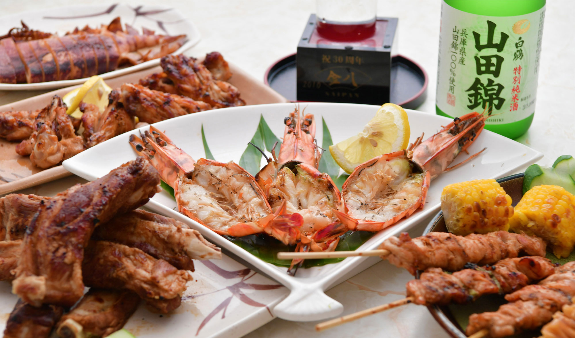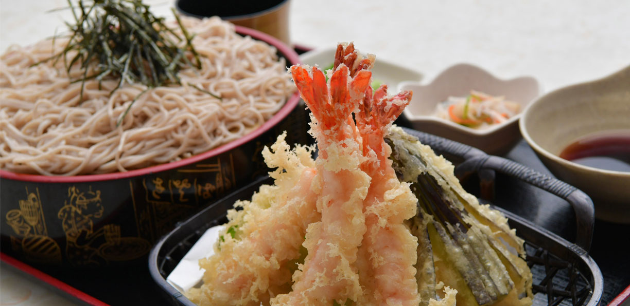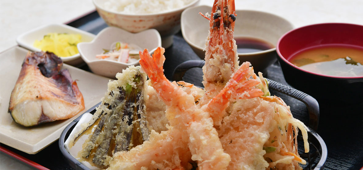 天ぷら盛り合わせ、サバの塩焼き、小鉢、ご飯、味噌汁、おしんこ
