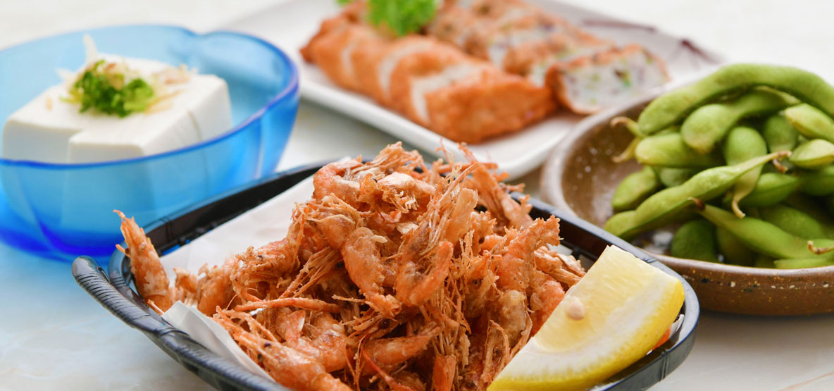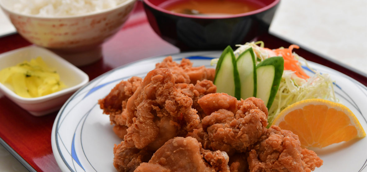 からあげ、サラダ、ご飯、味噌汁、おしんこ